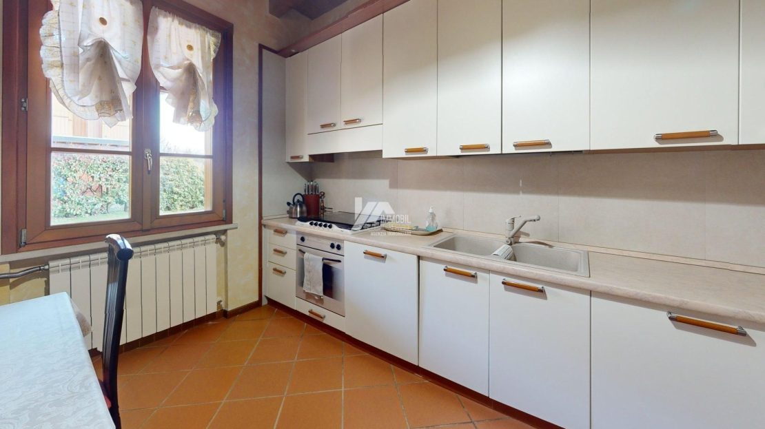 Accogliente e luminosa taverna con accesso diretto al giardino, bagno di servizio, garage doppio con doppia basculante e lavanderia. Ampio soggiorno con caminetto e cucina abitabile separata con doppia porta a scomparsa.